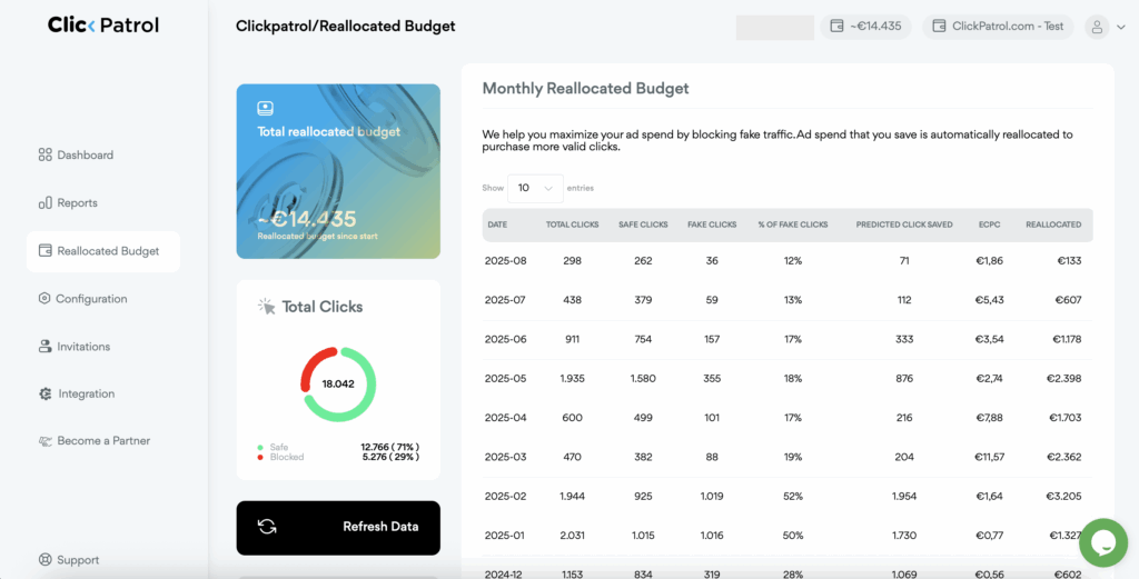 Inzicht met ClickPatrol in het budget dat geheralloceerd wordt, hoeveel fake clicks er zijn en meer.